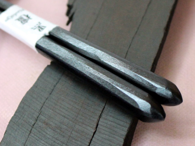 黒檀は心材は堅く漆黒色で磨くと光沢が出るので、昔から高級建築や器具、楽器などに用いられています。重厚感と光沢があるこれらの木地は漆塗り仕上げの高級箸にも用いられ、箸の木地として珍重されています。