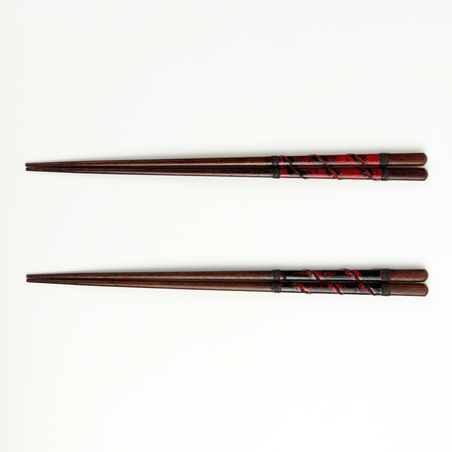 赤は・・・黒漆で中塗りを行い朱漆で上塗りした表面を研ぎ出し黒の模様が出ている根来塗りに糸を巻いた優雅なデザインのお箸です。