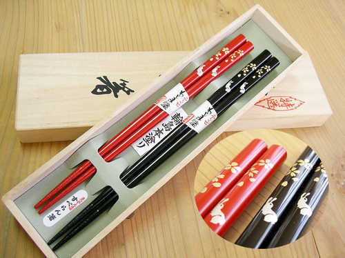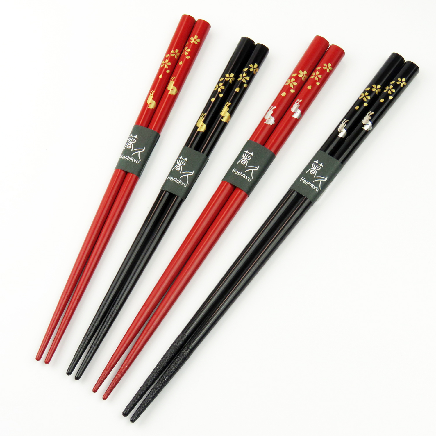 金箔の上の丸いうさぎがとても可愛らしい夫婦箸と福うさぎ箸置きのセットです。